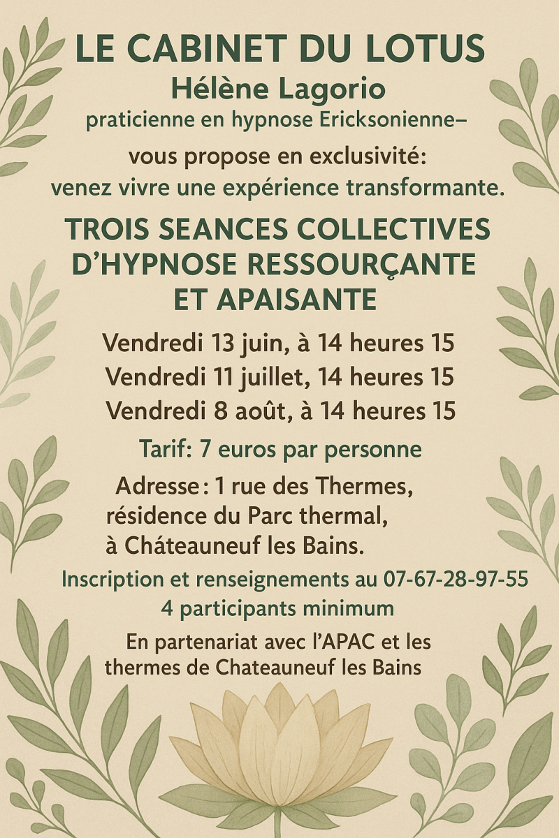 Retrouvez-moi en temps et en heure, sur les réseaux sociaux, pour connaître toute l'actualité du cabinet du lotus, notamment pour la rentrée qui s'annonce déjà bien remplie.